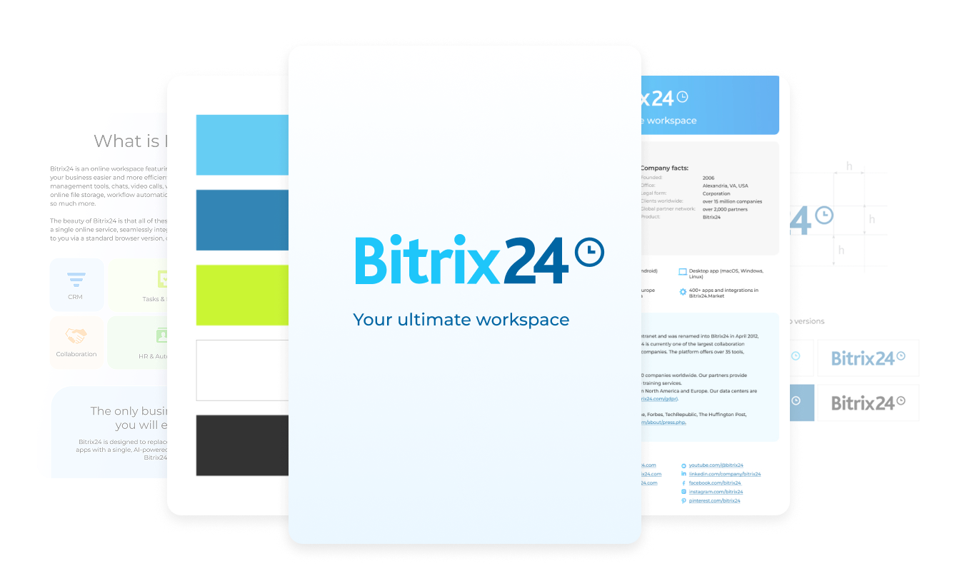 If you're writing an article, recording a video, or putting together any other Bitrix24-related content, this kit is your go-to source of useful materials – from our logo and brandbook to fact sheets and presentations. These materials will be especially helpful for Bitrix24 partners, news outlets, developers, influencers, agencies, and anyone else who's looking to represent Bitrix24 accurately and consistently.