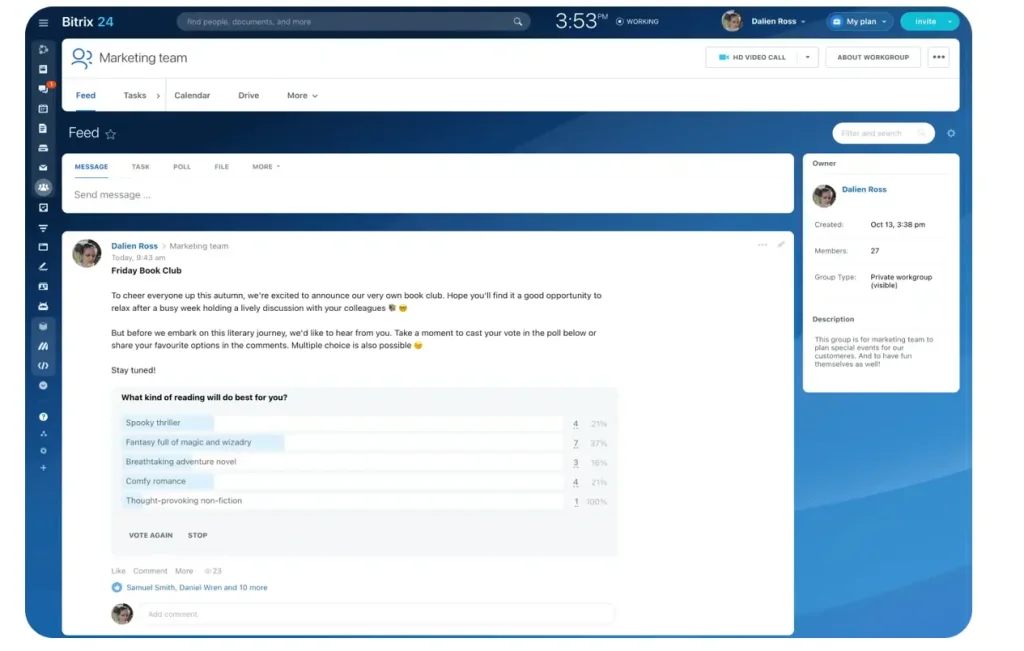 Workgroups in Bitrix24 let you create dedicated spaces for each client or campaign. Inside each group, you’ll find task boards, calendars, shared files, discussions, and chats—all in one place.