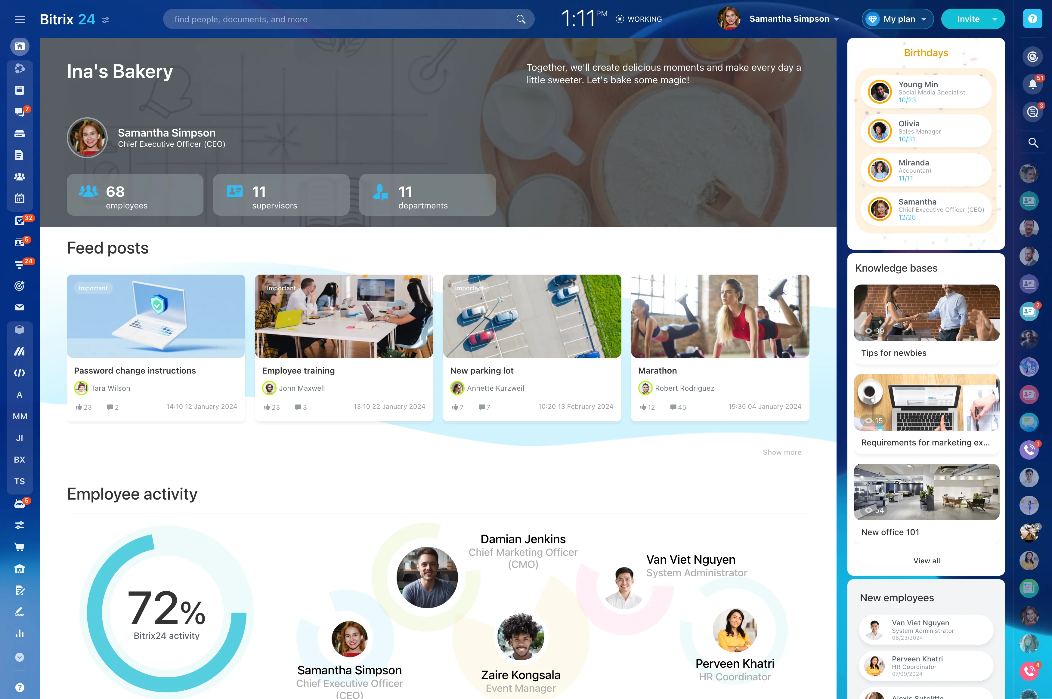 • The role-base access control (RBAC) in the Bitrix24 Company Structure section allows you to define roles and permissions, granting access only to authorized personnel. This way, HR teams and IT administrators can easily manage who can view or modify specific data.